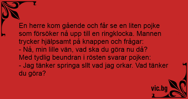 En herre kom gående och får se en liten pojke som försöker nå upp till en ringklocka. Mannen trycker hjälpsamt på knappen och frågar: