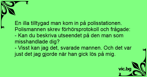 En illa tilltygad man kom in på polisstationen. Polismannen skrev förhörsprotokoll och frågade: