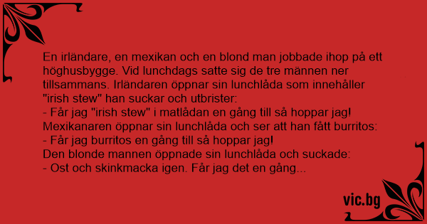 En irländare, en mexikan och en blond man jobbade ihop på ett höghusbygge. Vid lunchdags satte sig de tre männen ner tillsammans. Irländaren öppnar sin lunchlåda som innehåller "irish stew" han suckar och utbrister: