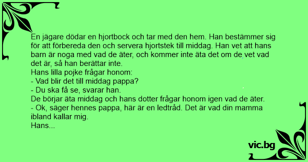 En jägare dödar en hjortbock och tar med den hem. Han bestämmer sig för att förbereda den och servera hjortstek till middag. Han vet att hans barn är noga med vad de äter, och kommer inte äta det om de vet vad det är, så han berättar inte.