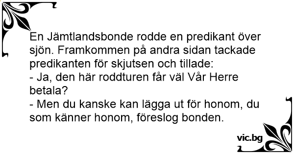En Jämtlandsbonde rodde en predikant över sjön. Framkommen på andra sidan tackade predikanten för skjutsen och tillade: