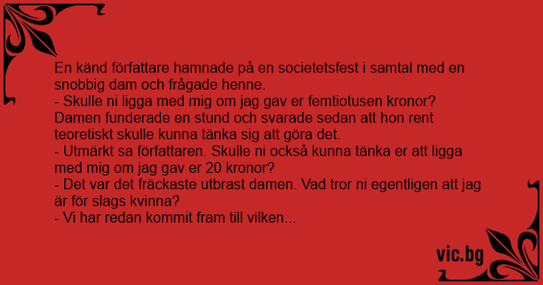 Ценкање Mit einem wildfremden Mann schlafen мужик подходит к женщине на улице и говорит: - ты со мной переспишь... Бизнисмен со непристоен предлог Мъж спира симпатично момиче и пита: Мъж пита непозната жена: Arkadaslari ile partiye giden Alican orada Sharen Stone’a benzer bir kiz görüp ona hayran kaliyor. Yavasça kizin yanina sokulup: Ein Mann fragt eine Frau: Churchill: Madam, would you sleep with me for £1 million? Una chica bellísima va caminando por la calle, cuando se le acerca un tipo y le dice: - ¿Te acostarías conmigo por un millón de dólares? - ¡¿Por un millón de dólares!? Bueno... este... me toma por... Um homem e uma mulher discutem: — Por um milhão de reais você dava para mim? — Puxa... Bem, por um milhão eu dava sim. O homem abre a própria carteira, olha e perguntar para a mulher: — E por 250... Csinos nőt leszólít egy férfi: - Hölgyem, lefeküdne velem egymillió forintért? A nő rácsodálkozik, majd csillogó szemmel így szól: "Le." - És lefeküdne velem 2000 forintért? - Mit képzel, ki vagyok... Een directeur vraagt aan zijn secretaresse; Zou je voor 1 miljoen met mij de nacht willen doorbrengen? Voor 1 miljoen wilde zij wel een nachtje met de directeur doorbrengen. En wat is het antwoord... Egy férfi megszólít egy nőt az utcán: - Mondja, hölgyem, lefeküdne velem egymillió dollárért? - Egymillió dollárért? Le. - És 50 dollárért? - Na de uram, mit gondol, mi vagyok én? - Hogy Ön... Un tip abordeaza o tipa pe strada: - Domnisoara, daca v-as oferi un milion de euro, v-ati culca cu mine? - Da, bineînteles! - Dar daca v-as oferi cinci euro? - Vai domnule, dar ce fel de femeie... Egy férfi megszólít egy csinos nőt az utcán: - Mondja hölgyem, négymillió forintért lefeküdne velem? - Négymillió forintért? Simán! - És ötezer forintért? - Hééé, mit gondol, mi vagyok én? - Hogy... A man walks up to a pretty woman in a bar. He says “Would you have sex with me for one million dollars?” “Sure!” The woman says. The man asks ” Will you have sex with me for ten dollars?” The woman... - Θα μου καθόσουν για ένα εκατομμύριο ευρώ; - Ναι. - Για είκοσι ευρώ θα μου καθόσουν; - Σε παρακαλώ, τι νομίζεις ότι είμαι; - Το τι είσαι το ξεκαθαρίσαμε. Τώρα κάνουμε παζάρια για την τιμή!