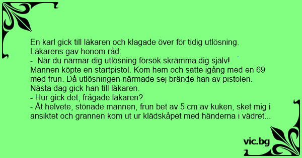 "Pane doktore, já mám problém. Já trpím předčasnou ejakulací. Jak se ženy jenom dotknu, skoro okamžitě se udělám. Manželka z toho nic nemá, jí se to nelíbí, furt mi to vyčítá a nechce se mnou spát....