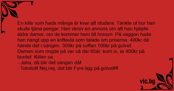 En kille som hade många år kvar att studera. Tänkte ut hur han skulle tjäna pengar. Han skrev en annons om att han hjälpte äldre damer, om de kommer hem till honom. På väggen hade han hängt upp en krittavla som talade om priserna. 400kr då hände det i sängen. 300kr på soffan.100kr på golvet.