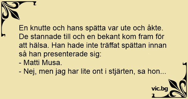 En knutte och hans spätta var ute och åkte. De stannade till och en bekant kom fram för att hälsa. Han hade inte träffat spättan innan så han presenterade sig:
