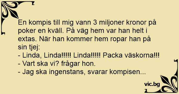 En kompis till mig vann 3 miljoner kronor på poker en kväll. På väg hem var han helt i extas. När han kommer hem ropar han på sin tjej: