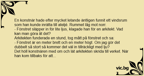 Det höll konstnären med om och lät arkitekten skrida till verket. När han kom tillbaks för att se resultatet upptäckte han att fönstret fortfarande var en meter brett och en meter högt. Men det var inte desto mindre dubbelt så stort som förut. Hur är det möjligt?