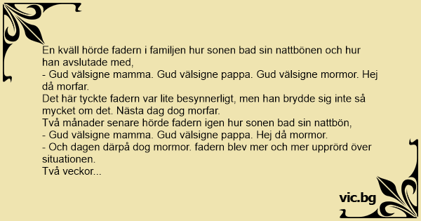 En kväll hörde fadern i familjen hur sonen bad sin nattbönen och hur han avslutade med,