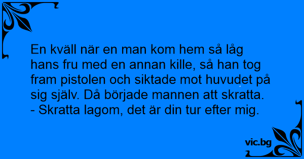 En kväll när en man kom hem så låg hans fru med en annan kille, så han tog fram pistolen och siktade mot huvudet på sig själv. Då började mannen att skratta.