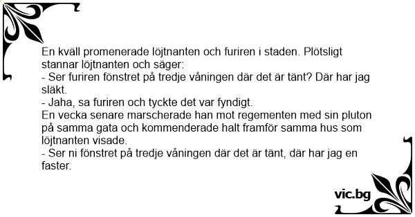 En kväll promenerade löjtnanten och furiren i staden. Plötsligt stannar löjtnanten och säger: