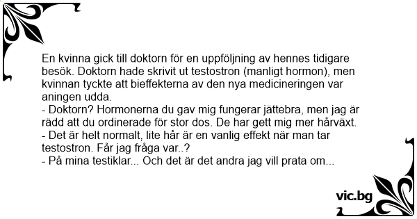 En kvinna gick till doktorn för en uppföljning av hennes tidigare besök. Doktorn hade skrivit ut testostron (manligt hormon), men kvinnan tyckte att bieffekterna av den nya medicineringen var aningen udda. - Doktorn? Hormonerna du gav mig fungerar jättebra, men jag är rädd att du ordinerade för stor dos. De har gett mig mer hårväxt. - Det är helt normalt, lite hår är en vanlig effekt när man tar testostron. Får jag fråga var..? - På mina testiklar... Och det är det andra jag vill prata om...