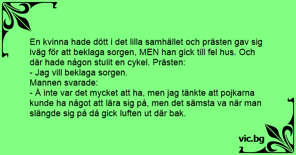 En kvinna hade dött i det lilla samhället och prästen gav sig iväg för att beklaga sorgen, MEN han gick till fel hus. Och där hade någon stulit en cykel. Prästen: