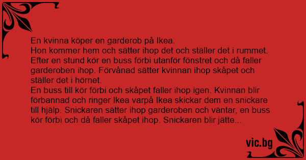 En buss till kör förbi och skåpet faller ihop igen. Kvinnan blir förваnnаd och ringer Ikea varpå Ikea skickar dem en snickare till hjälp. Snickaren sätter ihop garderoben och väntar, en buss kör förbi och då faller skåpet ihop. Snickaren blir jätte förvånad och undrar vad problemet är. Han sätter ihop skåpet igen och säger till kvinnan: