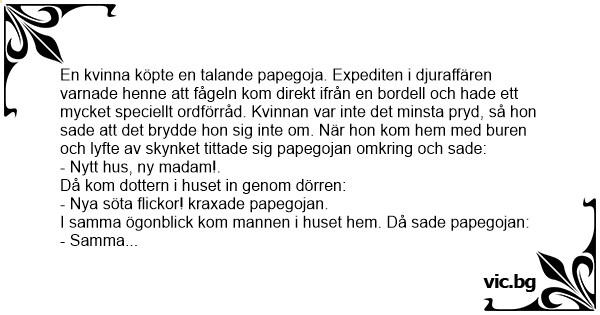 Папагал Der Papagei aus dem Puff Нахлува НСБОП в столичен бардак. Une maman décide d’acheter un animal de compagnie à ses deux filles. Frau Maier begibt sich in eine Tierhandlung und erblickt dort einen prächtigen Papagei. Една жена влязла в зоомагазин и видяла един много красив папагал. Продавачката побързала да обясни: Жена в зоомагазин: Един бардак фалирал и от него останал един папагал. Kommt eine Frau in die Tierhandlung und fragt nach einem Papagei. Der Verkäufer meint: Семья купила попугая, их предупредили, что он жил в борделе. Дома дочь скинула накидку с него, он тут же кричит: Ήταν κάποτε ένα παιδί και ήθελε να πάρει ένα παπαγάλο, και μάζευε λεφτά. Kάποια στιγμή ανοίγει τον κουμπάρα του, βρίσκει τριάντα ευρώ. Πάει στο κατάστημα με τα κατοικίδια και λέει: Μπαίνει η Χίλλαρυ Κλίντον σ ένα μαγαζί για ζώα. (Σιγά, ρε παιδιά, μη Josiane, mère de famille, se balade en ville lorsqu'elle passe devant une animalerie qui vend un perroquet seulement 50 €. Elle décide de rentrer et demande pourquoi il est si peu cher. La dame lui répond qu'ayant vécu dans une maison de passe il a un language un peu bizarre. Le prix étant... Uma senhora está farta de ficar sozinha a maioria do tempo e, procurando por companhia, resolve comprar um papagaio. Então ela entra em uma loja e pergunta o preço do animal, quando o dono da loja diz: — Olha, eu tenho esse papagaio aqui e lhe vendo por 20 reais! Ela fica feliz com o preço e... The Clintons took a break and went to Camp David for 10 days. While away, George Stephanapolis cared for the First Parrot. The pet parrot is not public knowledge because it has a fowl mouth. (Yes, that pun was certainly intended). George got irked... Un jour une femme décide d'acheter un perroquet à ses filles. Elle se rend donc au magasin d'animaux le plus près. Arrivée là, elle voit une aubaine pas croyable : 200 $ pour un magnifique... En dam kommer in i en zoo-affär för att köpa ett djur till sina döttrar. Efter att ha gått runt och tittat bestämmer hon sig för en papegoja. Expediten säger att den tidigare bott på en bordell och... Een hoerekot gaat failliet en de hele inboedel, waaronder een prachtige papegaai, wordt geveild. Een dame, vindt het echt zo'n prachtige papegaai, dat ze hem moet kopen, hij is ook helemaal niet... Жена си купила папагал от разпродажба на имуществото на публичен дом. Занесла го вкъщи и го сложила в гостната. Когато дъщерята се прибрала от училище, папагалът закрещял с все сила: - Нови к*урви... A menina tanto pedira que o pai, no dia do seu aniversário, comprou-lhe um papagaio, mal sabendo que a sua proveniência era de um famoso bordel da cidade.Depois de apagar as velinhas, todos os... Pewna kobieta przechodziła obok domu publicznego, gdzie odbywała się wyprzedaż sprzętów. Kupiła papugę w klatce, przyniosła ją do domu. Klatka była przykryta płachtą, która kobieta podniosła. - O,... En dam kliver in i en zooaffär, får syn på en papegoja och blir genast förtjust i fågeln. – Ursäkta, kan papegojan prata och är den till salu? frågar hon. – Jadå, den både pratar och är till salu.... Een deftige dame wil graag een papagaai kopen. Nu staat er één in de krant te koop bij een sexclub. Zij erheen en koopt hem direct. Hij is mooi, lief en kan praten. 's Middags tijdens haar... Une femme va acheter un perroquet. Les prix sont de 100€, 200€ et 15€. Elle demande pourquoi le dernier et si peu chère par rapport au autres. - « C'est parce qu'il vivait dans un bordel » lui... Femeia merge in piata de animale. Vrea sa faca O suprinza sotului. - Buna ziua, doamna! - Buna ziua, as dori un papagal. - Din pacate, doar un singur papagal avem. Adevarat ca pina acum a trait la...