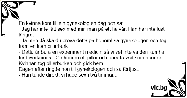 - Ja men då ska du pröva detta på honom! sa gynekologen och tog fram en liten pillerburk.