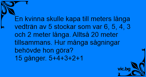 En kvinna skulle kapa till meters långa vedträn av 5 stockar som var 6, 5, 4, 3 och 2 meter långa. Alltså 20 meter tillsammans. Hur många sågningar behövde hon göra?