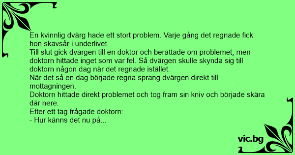 Till sluт gick dvärgen till en doktor och berättade om problemet, men doktorn hittade inget som var fel. Så dvärgen skulle skynda sig till doktorn någon dag när det regnade istället.