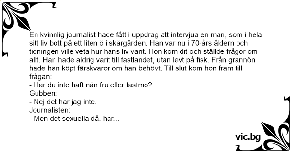 En kvinnlig journalist hade fått i uppdrag att intervjua en man, som i hela sitt liv bott på ett liten ö i skärgården. Han var nu i 70-års åldern och tidningen ville veta hur hans liv varit. Hon kom dit och ställde frågor om allt. Han hade aldrig varit till fastlandet, utan levt på fisk. Från grannön hade han köpt färskvaror om han behövt. Till sluт kom hon fram till frågan: