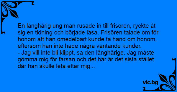 En långhårig ung man rusade in till frisören, ryckte åt sig en tidning och började läsa. Frisören talade om för honom att han omedelbart kunde ta hand om honom, eftersom han inte hade några väntande kunder.
