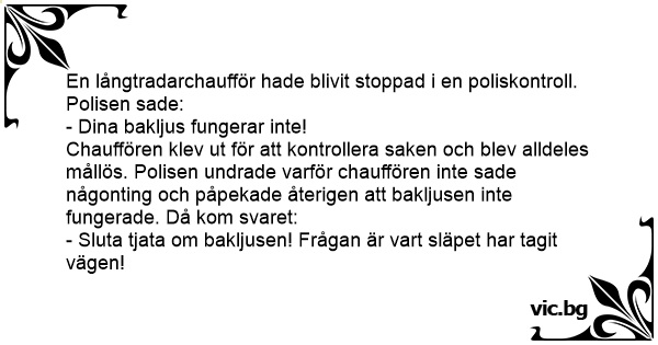 Chauffören klev ut för att kontrollera saken och blev alldeles mållös. Polisen undrade varför chauffören inte sade någonting och påpekade återigen att bakljusen inte fungerade. Då kom svaret: