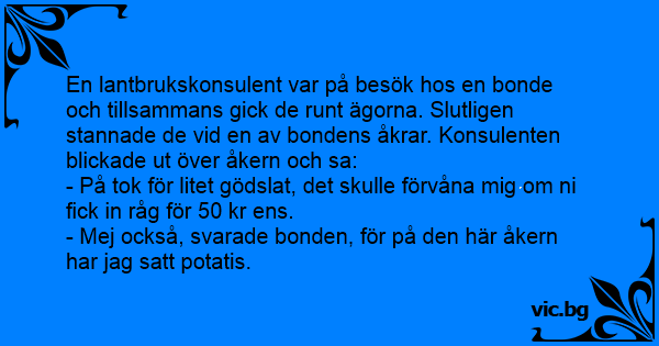 En lantbrukskonsulent var på besök hos en bonde och tillsammans gick de runt ägorna. Slutligen stannade de vid en av bondens åkrar. Konsulenten blickade ut över åkern och sa: