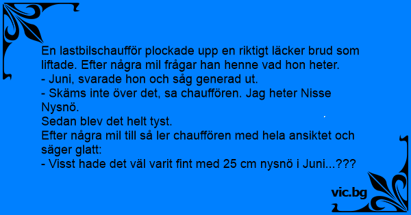 En lastbilschaufför plockade upp en riktigt läcker brud som liftade. Efter några mil frågar han henne vad hon heter.