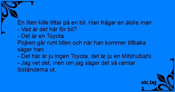 En liten kille tittar på en bil. Han frågar en äldre man: - Vad är det här för bil? - Det är en Toyota. Pojken går runt bilen och när han kommer tillbaka säger han: - Det här är ju ingen Toyota, det är ju en Mitshubishi. - Jag vet det, men om jag säger det så ramlar löständerna ut.