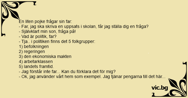 Капиталист, Влада, Народот… Was ist Politik Τι είναι πολιτική; Разговор между баща и син: Татко, какво е това политика? Un bambino va dal padre e dice: Подходит маленький сын к отцу и спрашивает: A little boy goes to his dad and asks, "What is politics?" Un fils demande à son père : Иванчо се прибира от училище, баща му го пита какво са учили. Маленький мальчик идет к отцу и просит объяснить ему, что такое политика. O garotinho pergunta ao pai: Pierre revient de l'école et dit à son père: - Papa, demain j'ai un devoir sur la politique, tu peux m'en parler ? - Bien sûr! Je pense que la meilleure méthode pour te parler de politique c'est de faire une analogie avec notre famille: Je suis capitaliste car je nourris la famille. Ta mère... Een zoon vraagt aan zijn vader: Pap, wat is eigenlijk politiek. Vader zegt: Jongen, dat is heel eenvoudig. Kijk, Ik breng het geld thuis, dus ben ik het KAPITALISME. Je moeder beheert het geld, dus... "Baba hayat bilgisi dersinde yonetimleri isliyoruz, bana demokrasiyi anlatirmisin?" demis. Babasi: "anlatmasina anlatirimda yavrum ama senin bazi tanimlari bilmen gerekiyor" demis, "Bak simdi... En 7-årig pojke frågade sin pappa: - Pappa vad är politik för något? Pappan svarade: - Jo, jag ska förklara för dig. Det år så här. När jag kommer hem med lönen då är jag KAPITALISM, din mamma... O garoto pergunta a seu pai: - O que é política papai? E seu pai responde: - Vou pegar o exemplo de casa p/ responder...sua mãe é o GOVERNO porque cuida de você, eu sou o CAPITALISMO porque... Едно дете го прашува својот татко: - Тато што е тоа политика? - Епа тоа ти е вака сине: Јас во фамилијава заработувам, значи јас сум капитализам, јас им плаќам на чистачката и дадилката значи тие... - Isä, meillä on ainekirjoitusta koulussa. Saanko kysyä jotain ? - Tietysti, poikani! Kysy pois. - Mikä on politiikka? - No jaa, politiikassa on viisi ryhmää: 1) kansa 2) hallitus 3) talousvalta 4)... Ali 3. sınıfa giden zeki bir çocuktur.bir gün öğretmeni Ali'ye "SİYASET" nedir diye sorar. Ali düşünür ama o çocuk aklıyla cevap veremez. Eve gider kitaplara bakar ama hiçbirşey anlayamaz. O da... Fragt der Sohn seinen Vater, was Politik sei. Daraufhin der Vater: "Das ist schwer zu erklären…, nehmen wir zum Beispiel unsere Familie, ich bringe das Geld nach Hause, also nennt man mich... O filho fala para o pai: — Pai, eu preciso fazer um trabalho para a escola, posso te fazer uma pergunta? — Claro meu filho. Qual é a pergunta? — O que é Política, pai? — Bem, vou usar a nossa casa... Malý synek se ptá tatínka, co je to kapitalismus. Tatínek chvíli přemýšlí a pak začne povídat: „Já jsem živitel rodiny, chlapče, já budu KAPITALISTA. Tvoje matka se stará o rodinné finance, budeme... A kisfiú kérdezi az apját, hogy mi a politika. Az apja leülteti, és példákkal elmagyarázza: - Figyelj, fiam. Én hozom haza a pénzt, tehát én vagyok a KAPITALIZMUS. - Anyád ügyel a pénzre, tehát ő a... Un copil isi intreaba parintele: - Taticule ce-i aia Politica? Taica-su ii explica: - Eu aduc banii in casa: sunt Finantele; maica-ta scoate banii din casa, ea este Guvernul; bunicul are grija ca... Qu'est-ce que la politique? Un enfant demande à son papa : - « Expliques-moi ce que c’est que la politique ». Le papa répond : - « C’est très simple. Je vais te donner un exemple. Dans notre... Den 7-årig pojke frågade sin pappa: - Pappa, vad är politik? - Jo, det är såhär: när jag kommer hem med lönen är jag KAPITALISM, din mamma som bestämmer här hemma är REGERINGEN, din farfar som ser... El profesor le pide al sus alumnos investigen que es la democracia Jaimito va con su papá y le dice Papá explicame que es la democracia Bueno hijo yo como soy el que manda en la casa soy el... Підходить маленький син до батька й запитує: — Тато, скажи, що таке політика? — Поясню тобі на прикладі нашої родини. От дивися: Я заробляю гроші, це означає що я міністерство фінансів. Мама... Pierino chiede a suo papà: "Papà cos'è la politica?" Il papà risponde: "Ti faccio un esempio, io sono il capitalista perchè porto i soldi a casa, tua madre è il governo perchè gestisce i soldi, la... Pappan har sin lille son med sig på ett politiskt möte. Väl hemma igen vid middagsbordet frågar pojken: - Pappa, vad är en kamrat? - Det kan man säga att du och jag är. - Men vad är folket då? -... Papá papá, no entiendo lo que es la política ¿me lo podrías explicar? - Claro hijo. Pues verás, tu madre es la que administra el dinero, sería la administación, yo soy el que lo trae, sería el... Un niño le pregunta al papá: ¿Qué es la política? El padre le contesta: Mira hijo, yo soy el Proveedor, el que trae la plata a la casa, tu mamá es el Gobierno, el que distribuye la plata, la nana... En rentrant de l'école, Toto dit à son père : - Papa, j'ai un exposé sur la politique à faire pour demain. Tu pourrais m'aider ? - Bien sûr ! Son père réfléchit pendant quelques minutes : - Je... Jānītis prasa tēvam: – Tēt, pastāsti kas ir politika? Tētis: – Nu skaties, piemēram, mūsu ģimene. Es pelnu naudu, tātad es esmu finanšu ministrija. Mamma vada saimniecību, tātad viņa ir valdība.... Um garotinho chega pro seu pai e diz que está precisando fazer uma pesquisa sobre política e pede ajuda à seu pai. O pai tenta explicar: — Olha, filho, vou dar um exemplo aqui de casa. Eu, que...