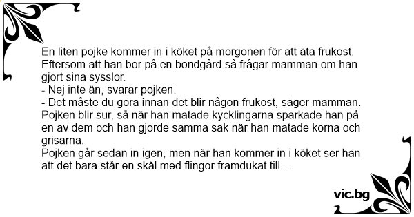 En liten pojke kommer in i köket på morgonen för att äta frukost. Eftersom att han bor på en bondgård så frågar mamman om han gjort sina sysslor.