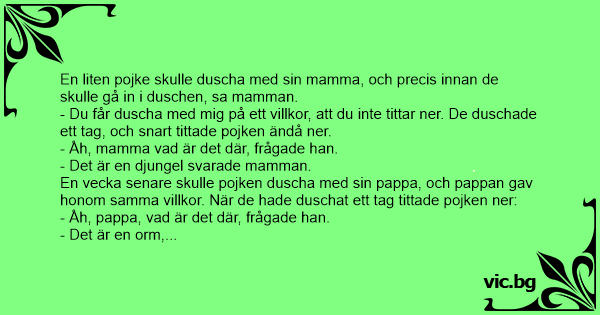 - Du får duscha med mig på ett villkor, att du inte tittar ner. De duschade ett tag, och snart tittade pojken ändå ner.