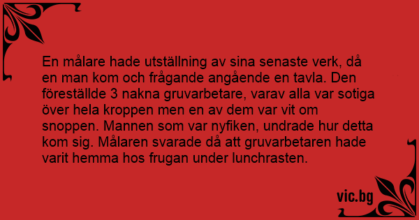 En målare hade utställning av sina senaste verk, då en man kom och frågande angående en tavla. Den föreställde 3 nakna gruvarbetare, varav alla var sotiga över hela kroppen men en av dem var vit om snoppen. Mannen som var nyfiken, undrade hur detta kom sig. Målaren svarade då att gruvarbetaren hade varit hemma hos frugan under lunchrasten.