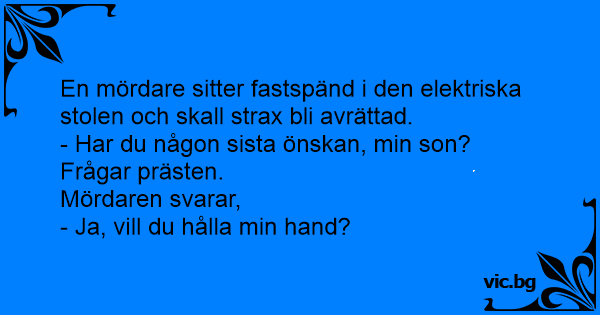 Fången har tagit plats i elektriska stolen och prästen frågar: - Har du någon sista önskan? - Jaa, håll mig i handen...