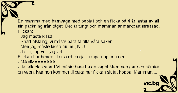 - Ja, alldeles snart! Vi måste bara ha en vagn! Mamman går och hämtar en vagn. När hon kommer tillbaka har flickan slutat hoppa. Mamman: