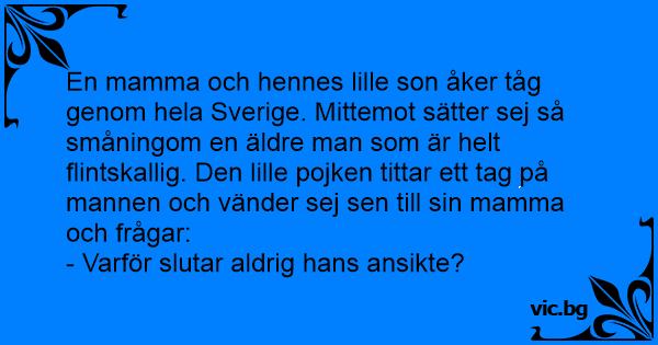 En mamma och hennes lille son åker tåg genom hela Sverige. Mittemot sätter sej så småningom en äldre man som är helt flintskallig. Den lille pojken tittar ett tag på mannen och vänder sej sen till sin mamma och frågar: