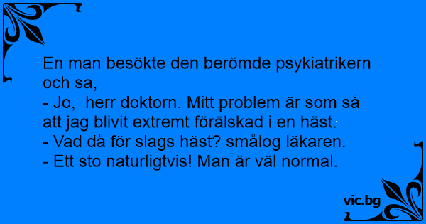 Ένας κτηνοτρόφος πηγαίνει να εξομολογηθεί Ο αμαρτωλός Αγρότης Фермер се изповядва: Докторот го прашува Трпе: Guy goes to his psychiatrist and says "I'm in love with my dog." "Well that is not so unusual, millions of people love their dogs." "But doctor, you don't understand. I'm physically attracted to my dog. I'm in love with my dog." "Well, is your dog male or female?" "Female, of course, what the... Arzt: „Was fehlt Ihnen?“ Patient: „Herr Doktor, ich liebe meinen Hund.“ Arzt: „Tut mir Leid. Als Krankheit ist das nicht anerkannt. Ich kann da nichts machen.“ Patient: „Aber Herr Doktor, ich liebe meinen Hund physisch …“ Arzt: “ Oh, ist es eine Hündin oder ein Rüde?“ Patient: „Eine Hündin... C'est un gars qui va chez le psychiatre et qui dit: - Docteur, je suis amoureux de mon cheval... Je le désire sexuellement! Le psy répond: - Hmmm, je vois ce que c'est. Et votre cheval, c'est un... Herr Schmitz zum Arzt: "Herr Doktor, ich liebe mein Pferd." "Na und - jeder liebt sein Tier. Ist doch nur natürlich, dass sie ihr Pferd lieben." "Herr Doktor - ich liebe mein Pferd auch physisch... "Ik ben verliefd op mijn paard", sprak de nerveuze man tegen de psychiater. "Dat is toch niet iets om u zorgen over te maken?" sprak de arts. "Veel mensen zijn gek op hun dieren. Mijn vrouw en ik... Un homme va chez son psy et lui dit : - Docteur, il faut que je vous dise, je suis tombé amoureux de mon cheval... - De votre cheval? - Oui docteur de mon cheval, et je le désire sexuellement... -... The Horse Lover A worried patient went to his psychiatrist. “I’m in love with my horse,” he said . “But that’s nothing,” replied the shrink. “A lot of people love animals. For instance, my wife and...