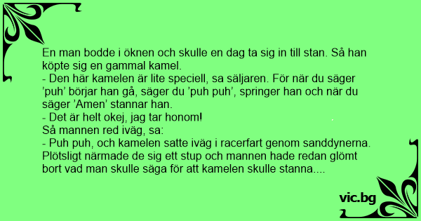 - Den här kamelen är lite speciell, sa säljaren. För när du säger ’puh’ börjar han gå, säger du ’puh puh’, springer han och när du säger ’Amen’ stannar han.