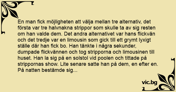 En man fiск möjligheten att välja mellan tre alternativ, det första var tre halvnakna strippor som skulle ta av sig resten om han valde dem. Det andra alternativet var hans flickvän och det tredje var en limousin som gick till ett grymt lyxigt ställe där han fiск bo. Han tänkte i några sekunder, dumpade flickvännen och tog stripporna och limousinen till huset. Han la sig på en solstol vid poolen och tittade på strippornas show. Lite senare satte han på dem, en efter en. På natten bestämde sig stripporna för att sticka från den där "äckelgubben" och på morgonen vaknade han alldeles ensam. Men men, tänkte han, jag har ju kvar huset. Senare under dagen kom en tant och krävde 150 000 i månadshyra. Han hade inte en spänn på sig, de tog tillbaka huset och han gick tillbaka till sin tjej. Där blev det en höger krok, så han flög nedför trappan, skadade sig ordentligt och blev tillslut en uteliggare som tjänade 50 öre om dan. TASKIGT LÄGE! tänkte han, och ja, det kan man ju säga...