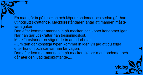 En man går in på macken och köper kondomer och sedan går han ut högljutt skrattande. Mackföreståndaren antar att mannen måste vara galen.