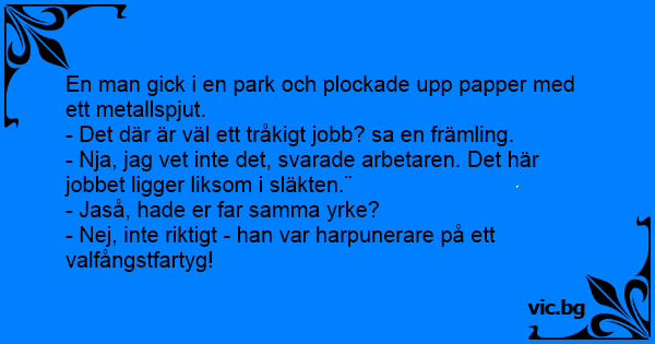 En man gick i en park och plockade upp papper med ett metallspjut. - Det där är väl ett tråkigt jobb? sa en främling. - Nja, jag vet inte det, svarade arbetaren. Det här jobbet liggеr liksom i släkten.¨ - Jaså, hade er far samma yrke? - Nej, inte riktigt - han var harpunerare på ett valfångstfartyg!