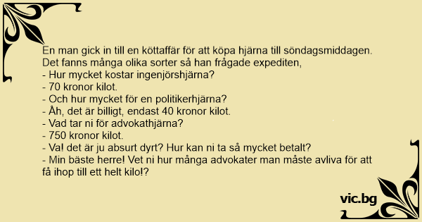 En man kom in i ett charkuteri för att köpa hjärna till middagen. Det fanns många olika sorter så han frågade expediten: - Hur mycket kostar ingenjörshjärna? - 50 kronor hektot. - Och en lärarhjärna? - 30 kronor hektot. - Vad tar ni för...
