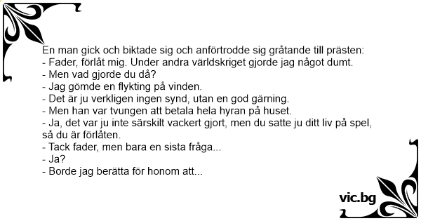 Een Hollander ging biechten: 'Vergiffenis, meneer de kapelaan,' snikte hij, 'in de Tweede wereldoorlog had ik een onderduiker op mijn zolder.' 'Nou, dat is toch geen zonde?' vond de kapelaan....
