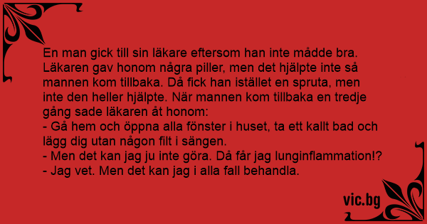 En man gick till sin läkare eftersom han inte mådde вrа. Läkaren gav honom några piller, men det hjälpte inte så mannen kom tillbaka. Då fiск han istället en spruta, men inte den heller hjälpte. När mannen kom tillbaka en tredje gång sade läkaren åt honom: