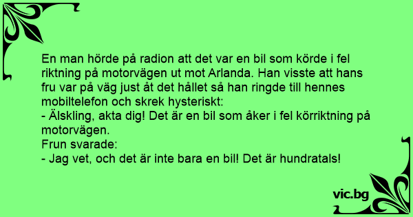 - Älskling, akta dig! Det är en bil som åker i fel körriktning på motorvägen.