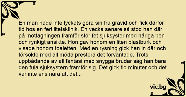En man hade inte lyckats göra sin fru gravid och fiск därför tid hos en fertilitetsklinik. En vecka senare så stod han där på mottagningen framför stor fet sjuksyster med håriga ben och rynkigt ansikte. Hon gav honom en liten plastburk och visade honom toaletten. Med en rysning gick han in där och försökte med all möda prestera det förväntade. Trots uppbådande av all fantasi med snygga brudar såg han bara den fula sjuksystern framför sig. Det gick tio minuter och det var inte ens nära att det skulle gå för honom. Det blev tjugo minuter och till sluт fyrtio minuter innan han svettig och med tennisarmbåge plus en halvtom mugg gick ut.