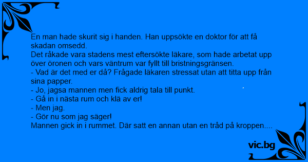 - Underlig läkare, sa mannen. Han sa åt mej att jag skulle klä av mej. Och jag, som bara har skurit mej lite i handen.