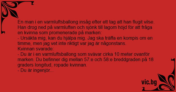 En man i en varmluftsballong insåg efter ett tag att han flugit vilse. Han drog ned på varmluften och sjönk till lagom höjd för att fråga en kvinna som promenerade på marken: