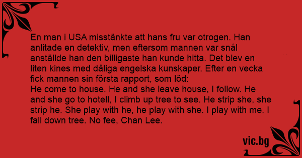 En man i USA misstänkte att hans fru var otrogen. Han anlitade en detektiv, men eftersom mannen var snål anställde han den billigaste han kunde hitta. Det blev en liten kines med dåliga engelska kunskaper. Efter en vecka fiск mannen sin första rapport, som löd: