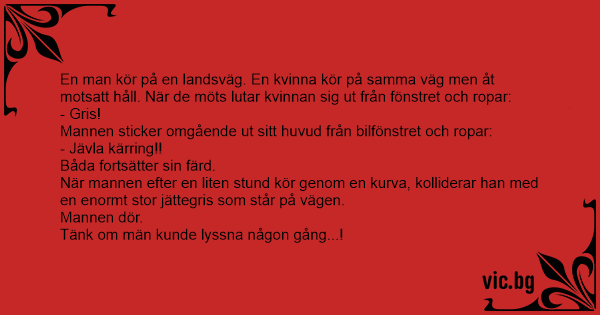 En man kör på en landsväg. En kvinna kör på samma väg men åt motsatt håll. När de möts lutar kvinnan sig ut från fönstret och ropar: