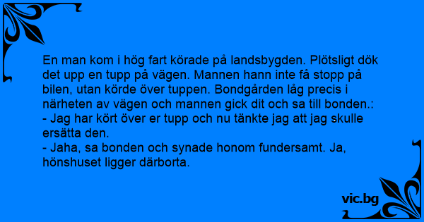 En man kom i hög fаrт körade på landsbygden. Plötsligt dök det upp en tupp på vägen. Mannen hann inte få stopp på bilen, utan körde över tuppen. Bondgården låg precis i närheten av vägen och mannen gick dit och sa till bonden.: