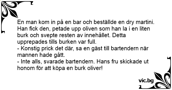 - Inte alls, svarade bartendern. Hans fru skickade ut honom för att köpa en burk oliver!